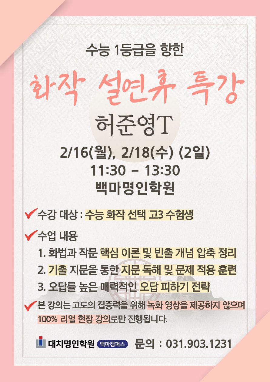 목적 : 학원 강좌 및 설명회 외 정보 제공 등 서비스, 고객관리수집항목 : 이름, 핸드폰번호, 학교, 학년, 계열보유기간 : 제출 시점부터 3년간 보유